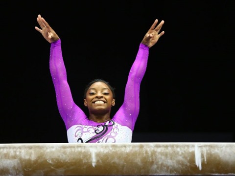 | Simones Biles lors du premier jour du P&G Gymnastics Championships à la Chaifetz Arena de Saint Louis, le 24 juin 2016. |