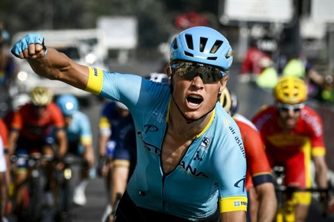 | Le Danois Magnus Cort Nielsen franchit la ligne d'arrivée lors de la 4e étape du Tour d'Oman, le 16 février. |