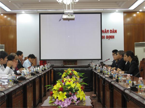 | Une séance de travail entre le président du Comité populaire provincial de Binh Dinh (Centre) et le président du groupe singapourien d’éducation KinderWorld, le 8 janvier à Binh Dinh |