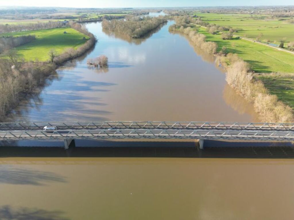 | Vue aérienne d'un pont sur la Loire le 19 janvier à Saint-Georges-sur-Loire (Maine-et-Loire) dans l'Ouest de la France. |