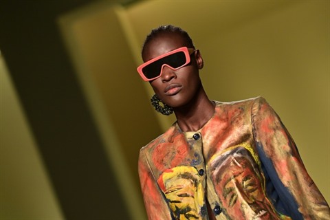 | Un mannequin présente la collection du styliste d'origine sénégalaise Mokodu Fall lors du défilé de "Black Lives Matter in Italian Fashion", le 17 février à Milan. |
