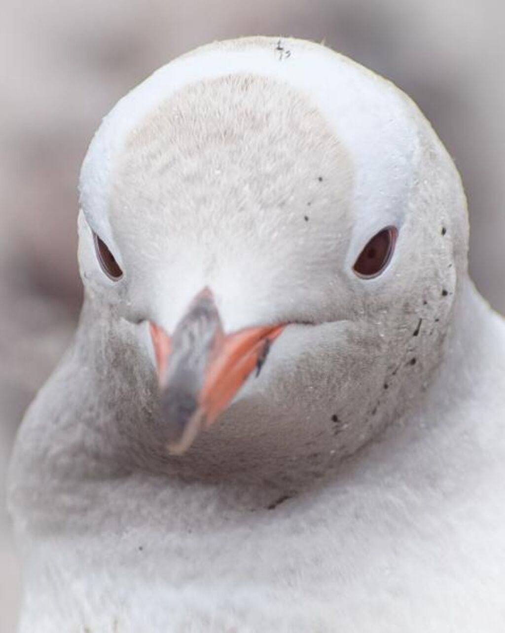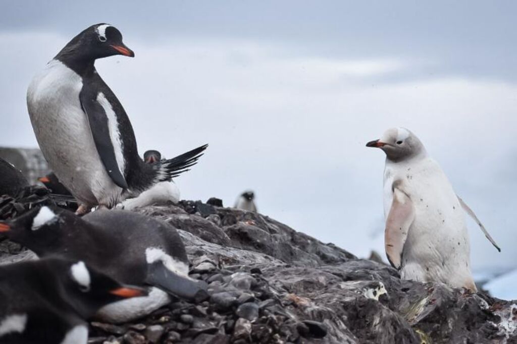 Sur les images filmées début janvier par l'équipe scientifique, on voit l'oiseau au bec et aux ailes faiblement rougeâtres et au plumage blanchâtre, marcher sur les rochers au milieu de sa colonie bicolore qui ne semble pas l'avoir rejeté.