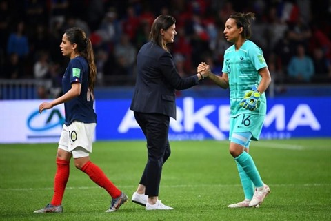 | Poignée de mains entre la coach des Bleues, Corinne Diacre, et la gardienne Sarah Bouhaddi à l'issue de leur victoire sur le Nigeria, à Rennes. |