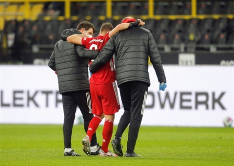 | Le milieu de terrain allemand du Bayern Munich, Joshua Kimmich (centre), sort du terrain après s'être blessé, à Dortmund le 7 novembre. |