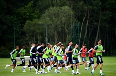 | Les joueurs de l'équipe de France à l'entraînement, le 4 juin à Clairefontaine. |