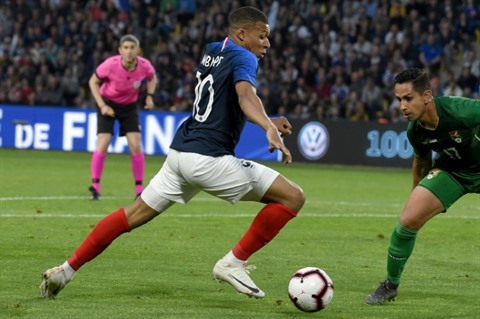 | L'attaquant des Bleus Kylian Mbappé (gauche) lors du match amical face à la Bolivie le 2 juin à Nantes. |