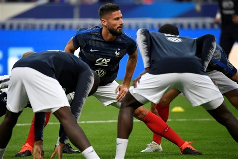 | Olivier Giroud à l'échauffement avec les Bleus avant leur match contre Andorre, en qualifications pour l'Euro, le 10 septembre au Stade de France. |