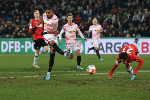 | Le milieu de terrain de Leipzig, Christopher Nkunku, ouvre le score sur le terrain d'Hanovre, lors du quart de finale de la Coupe d'Allemagne, le 2 mars. |
