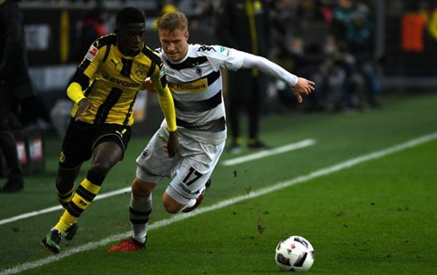 | Ousmane Dembélé (gauche), le 3 décembre 2016 avec à son adversaire Oscar Wendt lors du match des Borusses de Dortmund face à ceux de Mönchengladbach. |
