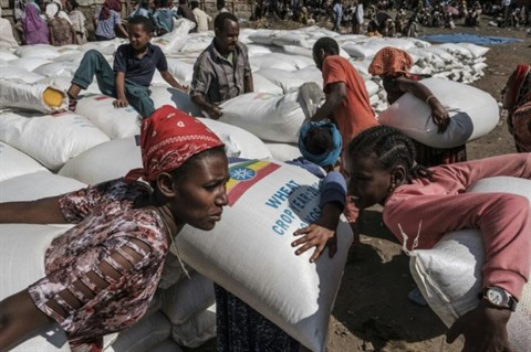 | Des femmes portent des sacs de blé lors d'une distribution de nourriture organisée par le gouvernement éthiopien dans la ville d'Alamata en décembre 2020. |