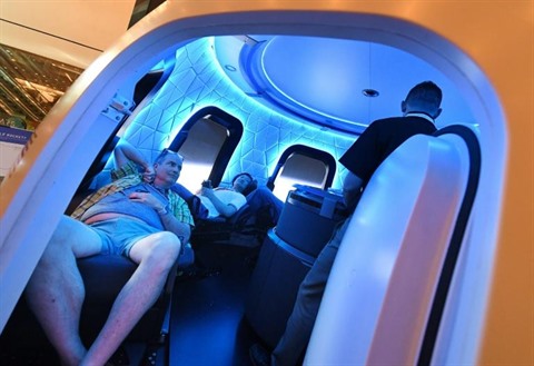 | Des visiteurs à l'intérieur d'une capsule de démonstration de Blue Origin, lors du salon Re:Mars organisé par Amazon, à Las Vegas, dans le Nevada. |
