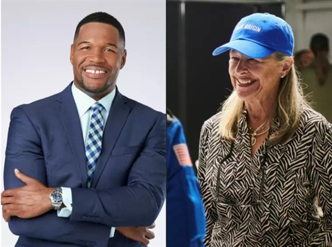 | Deux des six passagers du vol spatial de Blue Origin, le présentateur de télévision et ancien joueur professionnel de football américain Michael Strahan, et la fille du premier Américain dans l'espace, Laura Shepard Churchley. |