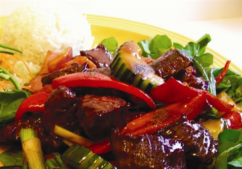 • Ajouter 1 cuillère à soupe d’huile de tournesol à la viande (B). Mettre la poêle sur le feu vif. Quand la poêle est chaude, ajouter la viande (B) et remuer pendant 2 minutes. Éteindre le feu et servir le plat dans une assiette.