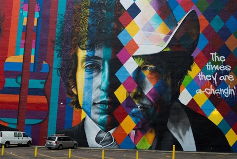 | Fresque de Bob Dylan réalisée par l'artiste brésilien Eduardo Kobra à Minneapolis, le 15 octobre 2016. |