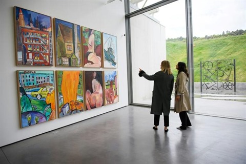 | Des visiteurs regardent des peintures du musicien et Prix Nobel de littérature Bob Dylan, exposées dans un domaine de Provence, Château La Coste, le 5 mai au Puy-Sainte-Réparade. |