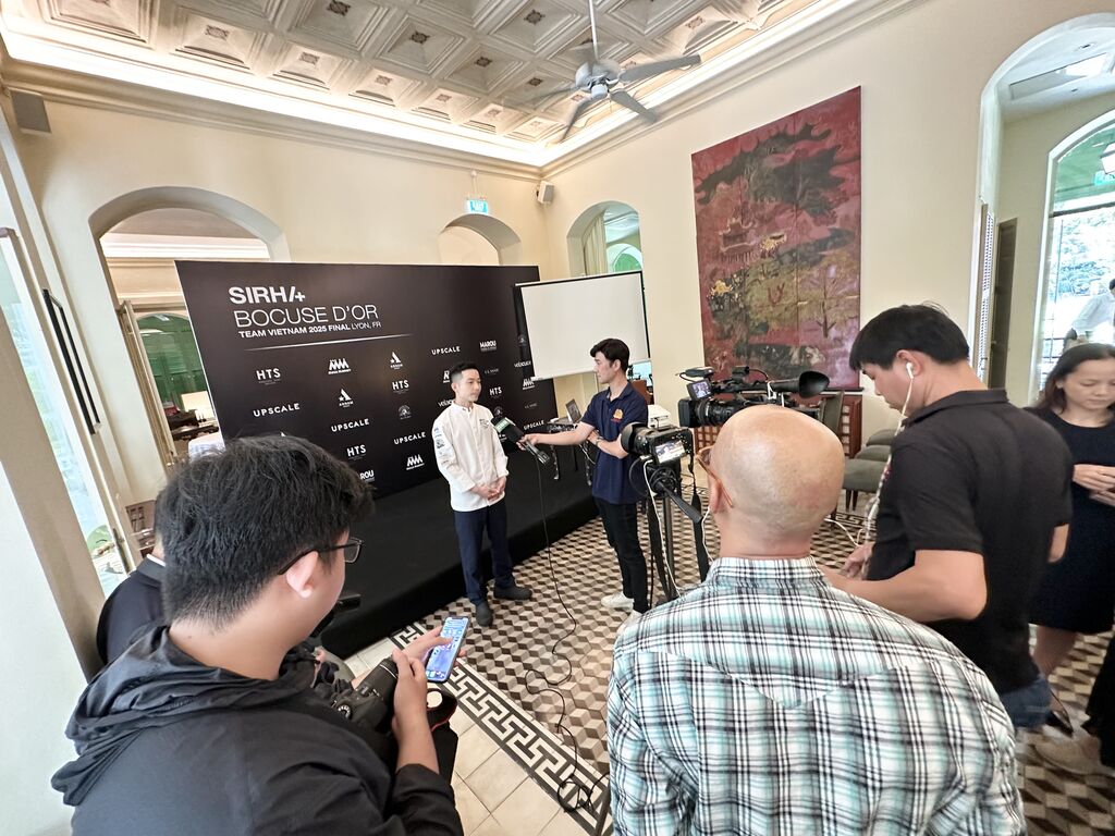 | Le chef Vu Xuân Truong, qualifié pour la finale du concours culinaire mondial Bocuse d'Or 2025, interviewé par les médias, lors du point presse. |