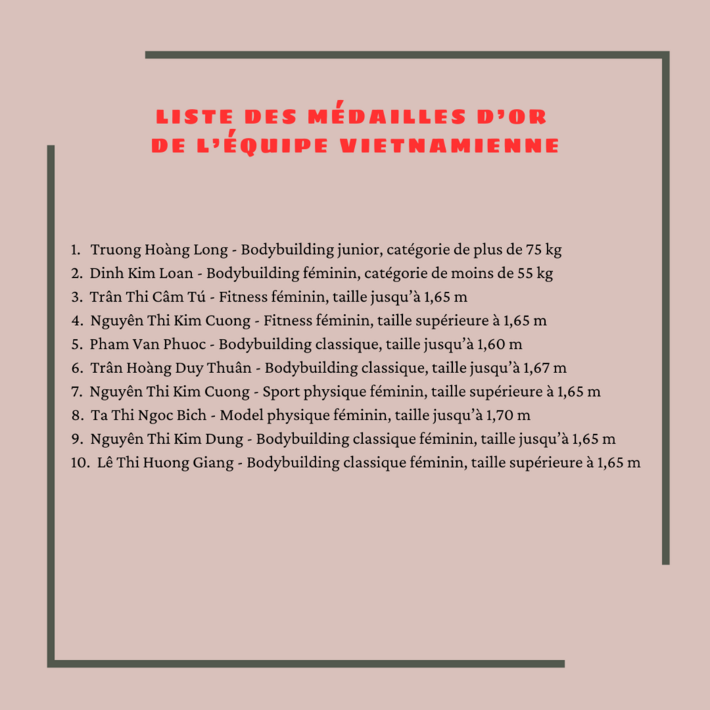 Un autre triomphe mémorable est celui de Nguyên Thi Kim Cuong, qui a empoché deux médailles d’or dans les catégories fitness et sport physique pour les femmes de plus de 1,65 m.