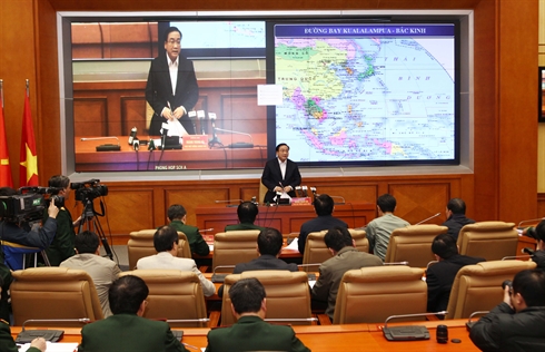 | Le vice-Premier ministre Hoàng Trung Hai (debout) dirige la recherche du Boeing 777-200 de la Malaysia Airlines, le 9 mars à Hanoi. |