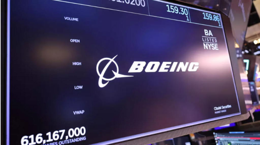 | Logo de Boeing sur un des écrans de la Bourse de New York le 4 septembre 2024. |