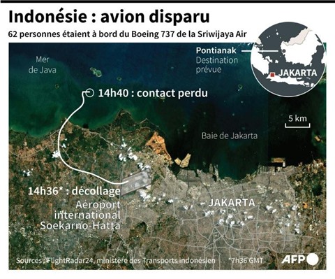 L'appareil de la compagnie indonésienne Sriwijaya Air reliant Jakarta à Pontianak, sur la partie indonésienne de l'île de Bornéo, a perdu le contact avec les contrôleurs aériens samedi 9 janvier peu après 14h40 heure locale (07h40 GMT), quelque 4 minutes après le décollage. Aucun détail n'a à été donné à ce stade sur les causes possibles de l'accident par les autorités qui ont lancé de vastes opérations de recherches alors qu'il apparaît peu probable de retrouver des survivants.