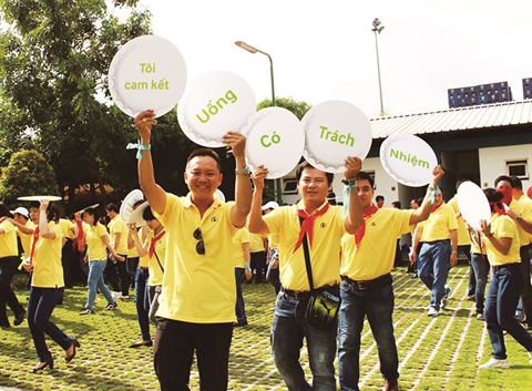 | Des jeunes, dont des conducteurs automobiles, participent à une campagne lancée par la VARD et arborent le slogan Tôi cam kêt uông co trach nhiêm (Je m’engage à boire avec responsabilité). |