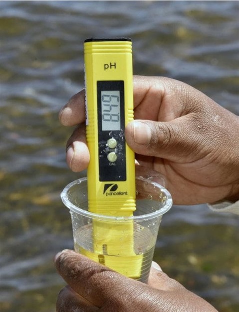 | Une indigène aymara mesure le PH du lac Titicaca à Puerto Perez, en Bolivie, le 18 avril. |