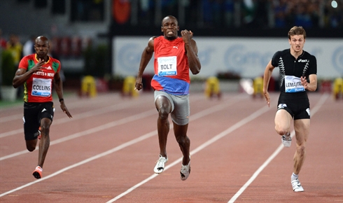 | Le Jamaïcain Usain Bolt (centre) en compétition le 31 mai à la Ligue de diamant de Rome. |