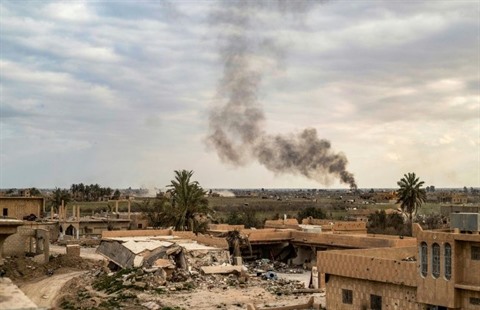 | Panache de fumée après un bombardement sur le dernier réduit du groupe État islamique en Syrie, le 15 mars. |