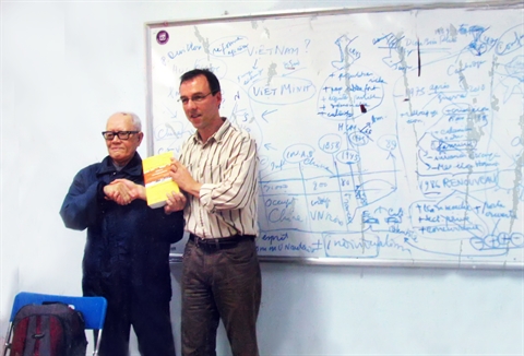 | Huu Ngoc (gauche) et Luc Rousseau, responsable du stage multidisciplinaire au Vietnam du Programme de sciences humaines du Cégep de Sherbrooke, en 2014 à l’Université de Hanoi. |