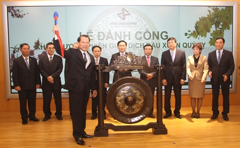 | Le vice-Premier ministre Vu Van Ninh (premier rang) a frappé le 18 février le tambour inaugurant officiellement la première séance de transactions à la Bourse de Hanoi |
