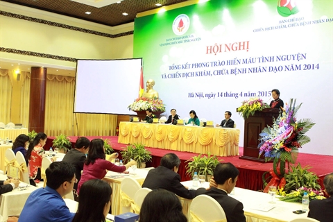 | Conférence-bilan des campagnes menées pour le don de sang et la réalisation de consultations médicales gratuites, le 14 avril à Hanoi. |