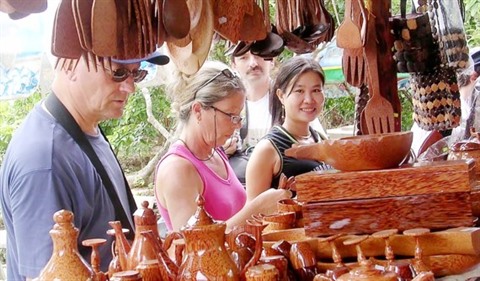 | Les touristes internationaux s’intéressent aux produits d’artisanat dérivés de la noix de coco à Bên Tre (delta du Mékong). |