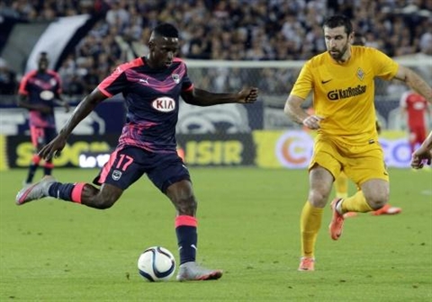 | Le milieu de terrain bordelais, André Poko (No17) face à Mikhail Bakaev du Kairat Almaty en barrage aller de l'Europa League, le 20 août à Bordeaux (France). Photo : AFP/VNA/CVN |
