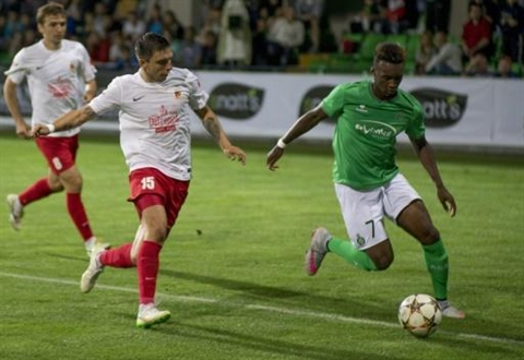 | Le Stéphanois Jean-Christophe Bahebeck poursuivi par Denis Rassulov de Milsami Orhei en barrage de l'Europa League, le 20 août à Chisinau (Moldavie). Photo : AFP/VNA/CVN |