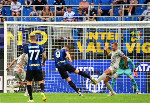 | Edin Dzeko frappe la balle et marque pour l'Inter Milan au stade San Siro de Milan, le 21 août. |