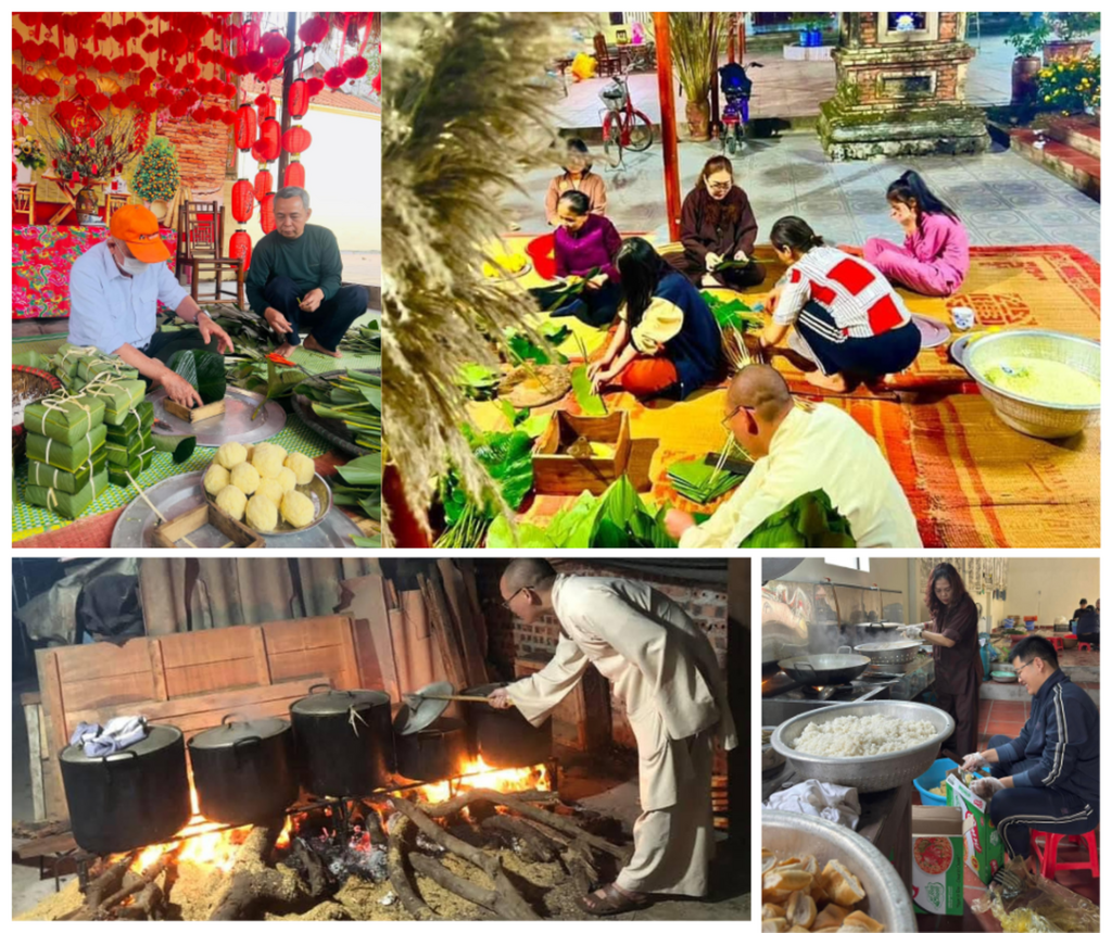 | À la cuisine de la pagode Phuc Long, le vénérable Thich Quang Tinh, les fidèles et les villageois s'affairent à préparer le +banh chung+ (gâteaux de riz gluant de forme carré, farcis de viande de porc et de haricot mungo) et les repas pour les démunis. |