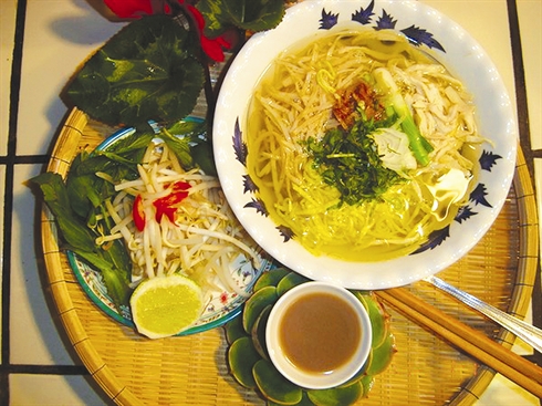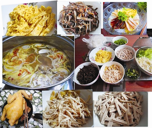 Bouillon : verser 3 litres d’eau dans une marmite avec quelques rondelles de ciboule et un peu de sel. Mettre la marmite au feu. Quand l’eau est chaude, y plonger le poulet dont la chair a, au préalable, été déchirée en filaments et le faire cuire. Mettre ensuite les travers de porc dans le bouillon de poulet obtenu et laisser mijoter jusqu’à ce que les os ramollissent. Ne pas oublier d’enlever régulièrement l’écume qui se forme à la surface. Ajouter les crevettes séchées dans le bouillon. Filtrer, puis ajouter nuoc mam, sel et glutamate. Couper le pâté de viande de porc bouillie en fines tranches. Préparer avec chaque œuf une omelette fine, que l’on découpe ensuite en de fins bâtonnets. Décortiquer les crevettes, les faire cuire à la vapeur, puis les piler. Couper finement persicaires et brins de ciboule.