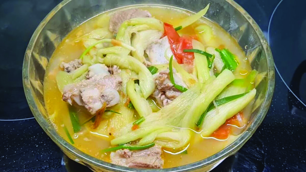 * Ajouter la ciboulette et la coriandre coupées juste avant d’éteindre le feu pour conserver leur couleur et leur parfum. Servir bien chaud avec du riz blanc ou des vermicelles de riz. Ce bouillon aigre délicat et rafraîchissant sera un vrai plaisir pour toute la famille.