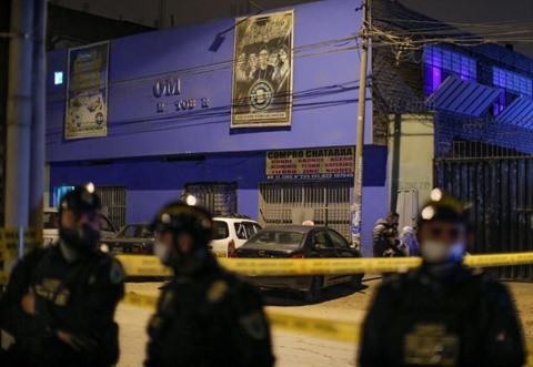 | Des policiers montent la garde devant la discothèque où s'est produit une bousculade mortelle à Lima, le 23 août. |