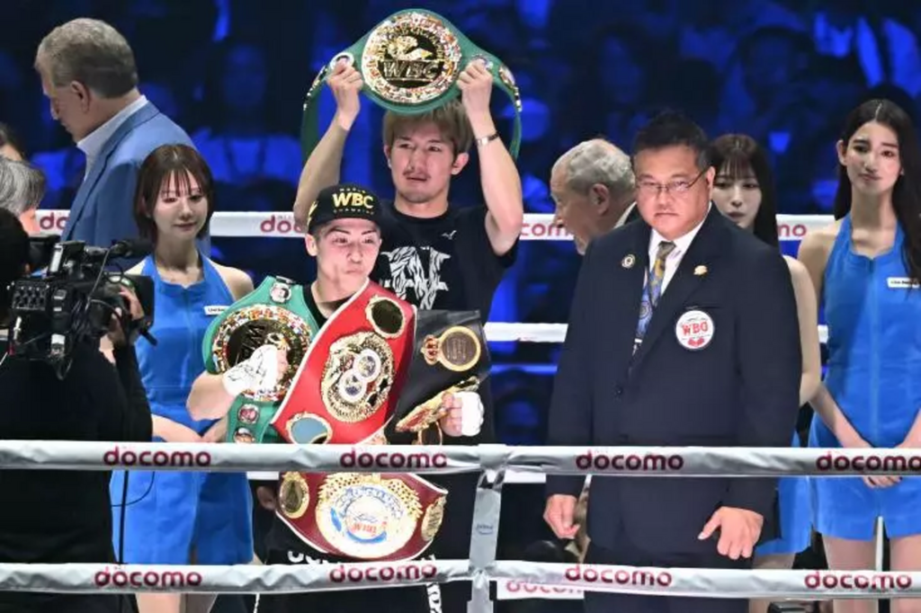 | Le Japonais Naoya Inoue (centre) a conservé ses quatre ceintures mondiales (IBF-WBA-WBC-WBO) des super-coqs en battant le Mexicain Luis Nery au Tokyo Dome le 6 mai. |
