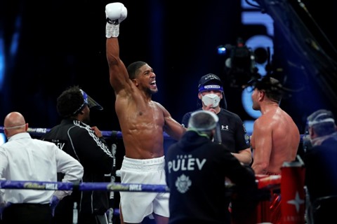 | Anthony Joshua heureux de sa victoire sur le Bulgare Kubrat Pulev en poids lourds à Wembley, le 12 décembre 2020. |