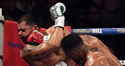 | Le Britannique Anthony Joshua (droite) donne un direct fatal au visage de l'Américain Eric Molina, |