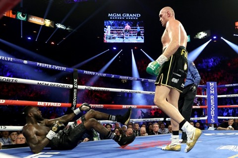 | L'Américain Deontay Wilder (gauche) à terre lors de sa défaite contre le Britannique Tyson Fury à Las Vegas (États-Unis), le 22 février. |
