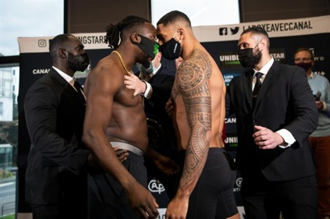 | Le Belge Joel Tambwe Djeko, alias Big Joe, et Tony Yoka (droite) tête contre tête, lors de la traditionnelle pesée avant leur combat, le 4 mars à Nantes. |