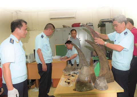 | Un trafic de cornes de rhinocéros, découvert en 2018, à la porte-frontière de l’aéroport international de Nôi Bài, à Hanoï. |