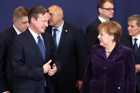 | Le Premier ministre britannique David Cameron et la chancelière allemande Angela Merkel, le 17 décembre à Bruxelles |