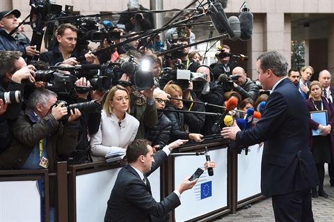 | Le Premier ministre britannique, David Cameron (droite) s'adresse aux médias à son arrivée au Conseil européen à Bruxelles, le 17 décembre. |