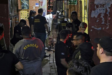 | Des médecins légistes et des policiers, dans un bar où une fusillade a fait 11 morts à Belem (Brésil), le 19 mai. |