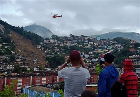 | Des habitants observent un hélicoptère des services de secours survolant un grand glissement de terrain à Petropolis (Brésil), le 18 février |
