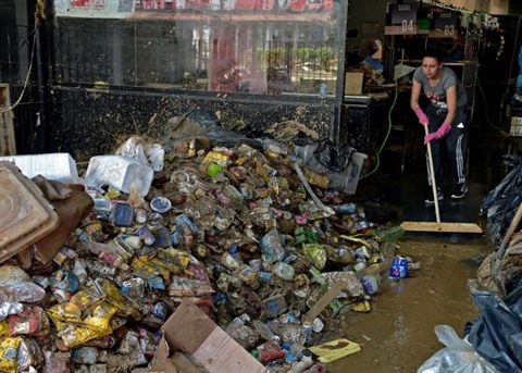 | Une femme nettoie un magasin après des inondations meurtrières à Petropolis, le 17 février |